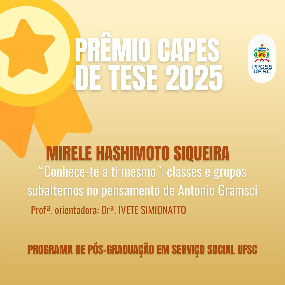 É com alegria que anunciamos o Prêmio Capes de Tese 2025 para a egressa de Doutorado Mirele Hashimoto Siqueira, do Programa de Pós Graduação em Serviço Social da UFSC, com o trabalho intitulado “Conhece-te a ti mesmo”: classes e grupos subalternos no pensamento de Antonio Gramsci”, orientado pela Profª. Drª. Ivete Simionatto.