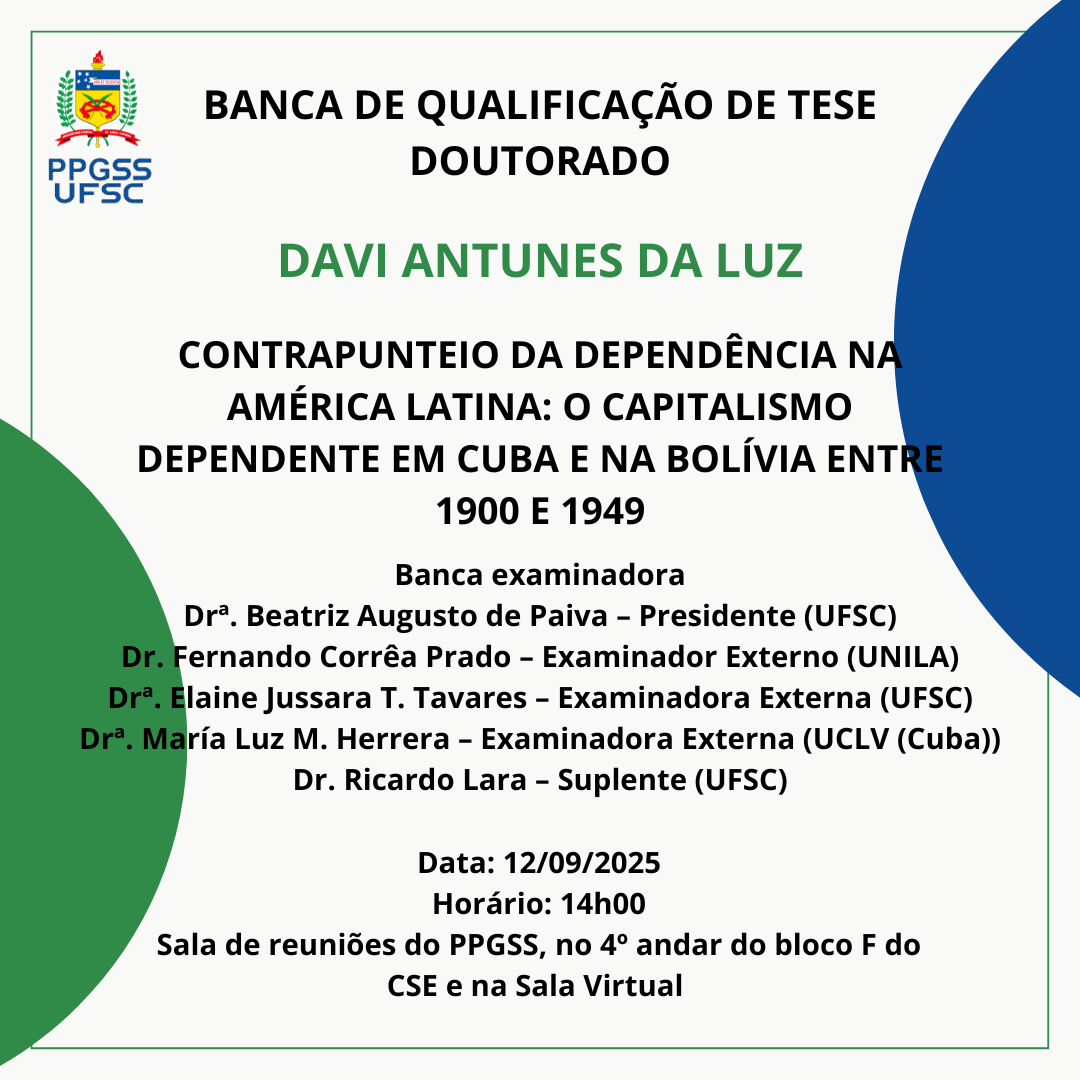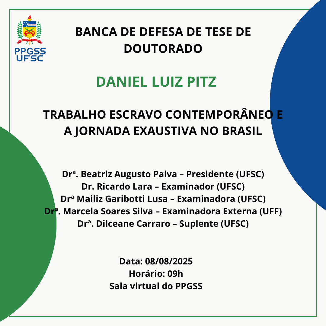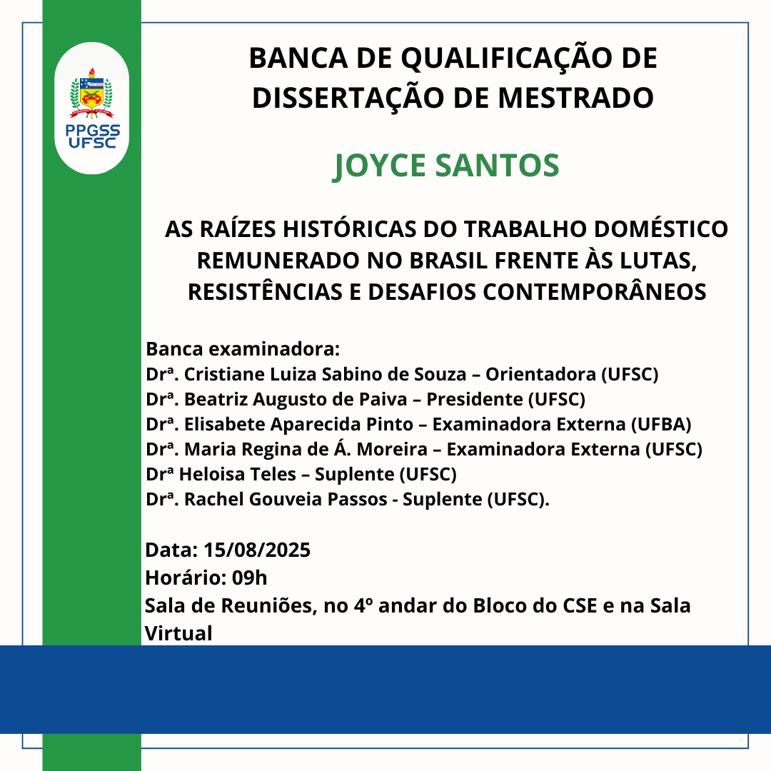 Inscrições abertas para a Primeira Chamada de 03 a 21 de setembro de 2025 e para a Segunda Chamada de 03 a 16 de novembro de 2025, pelo e-mail ppgss@contato.ufsc.br.